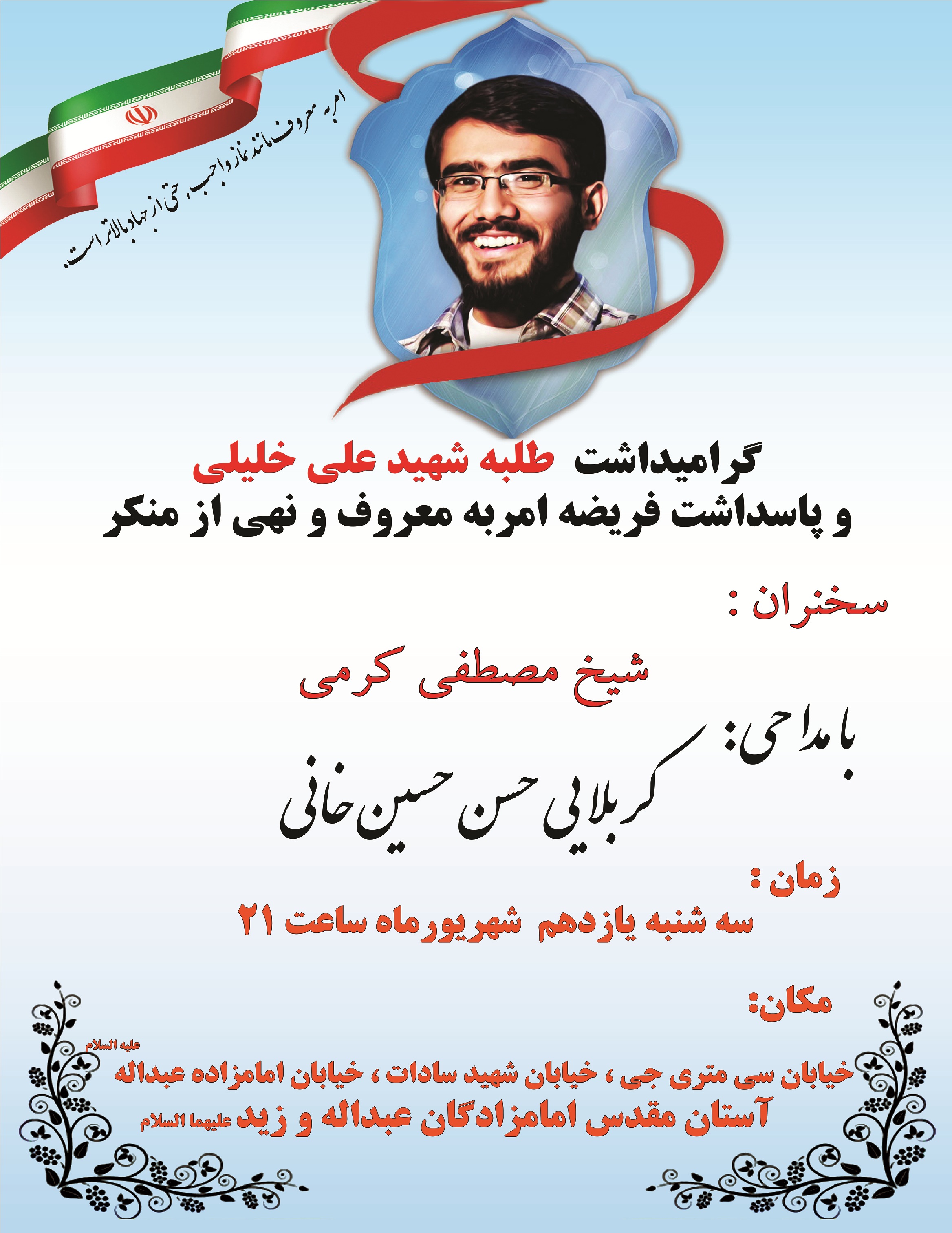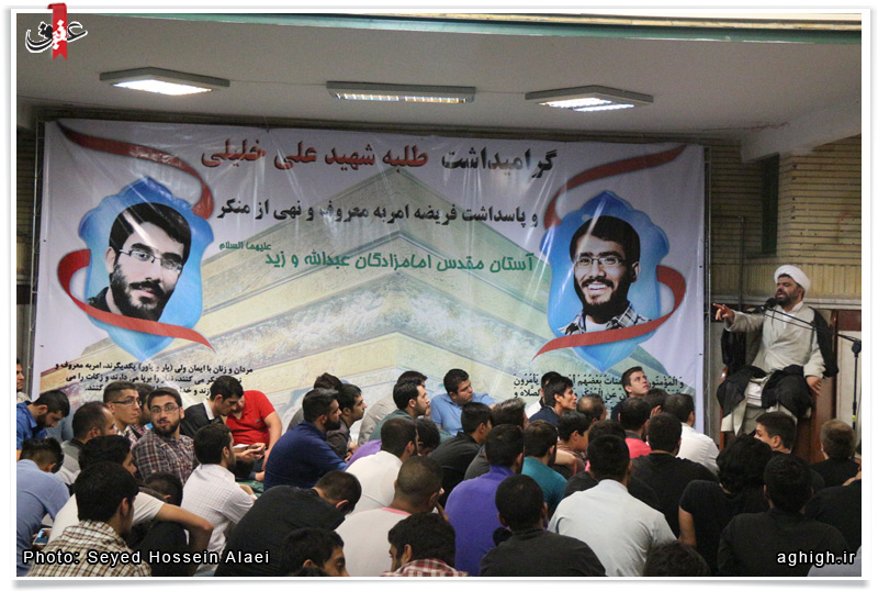 مراسم گرامیداشت شهید طلبه علی خلیلی شهید امر به معروف و نهی از منکر در آستان مقدس امام زادگان عبدالله و زید علیهما السلام برگزار می شود .